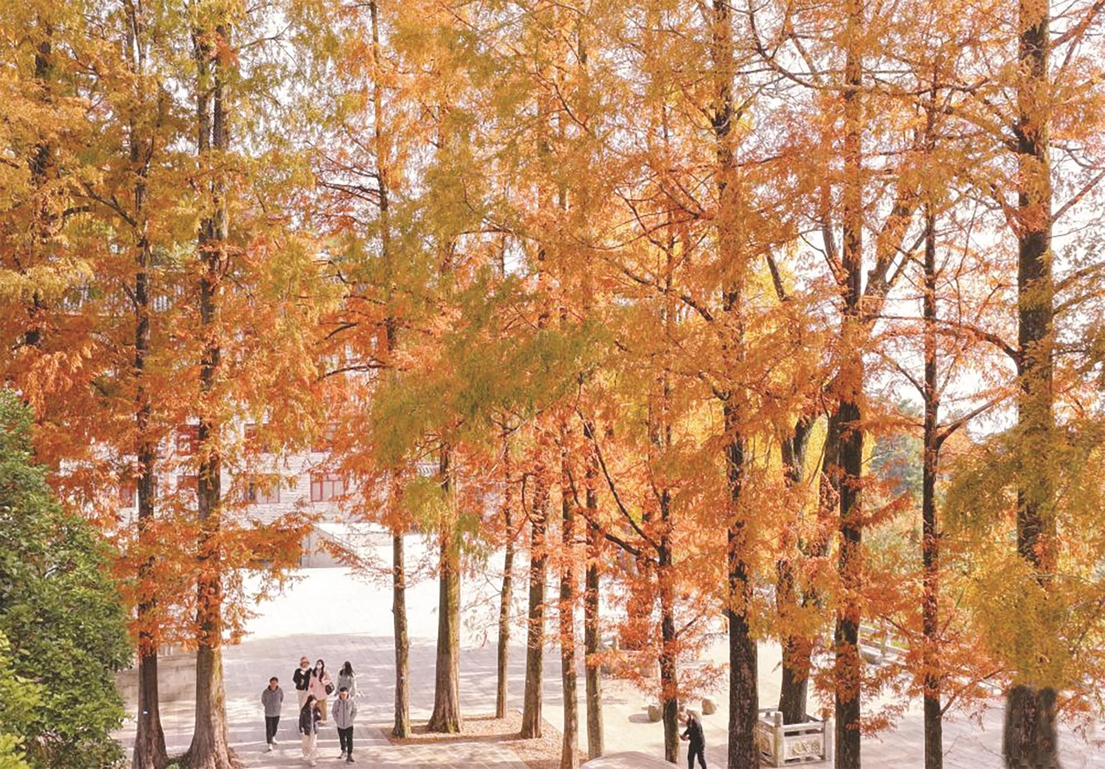 初冬时节,神州大地悄然开启了如诗如画的“美颜”模式。图为11月19日,游客在湖南省衡阳市南岳衡山风景区赏景游玩。(新华社发)