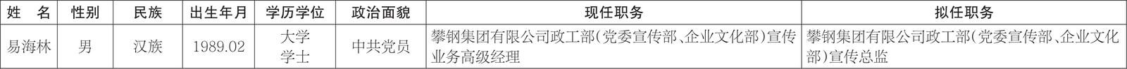 经攀钢集团有限公司党委组织部部务联席会研究决定,对攀钢集团有限公司总部1名拟任职人员实施任前公示。公示期间,广大职工对拟任职人员在德、能、勤、绩、廉等方面的意见,可采取来信、来电、来访等方式向攀钢集团有限公司党委组织部反映。