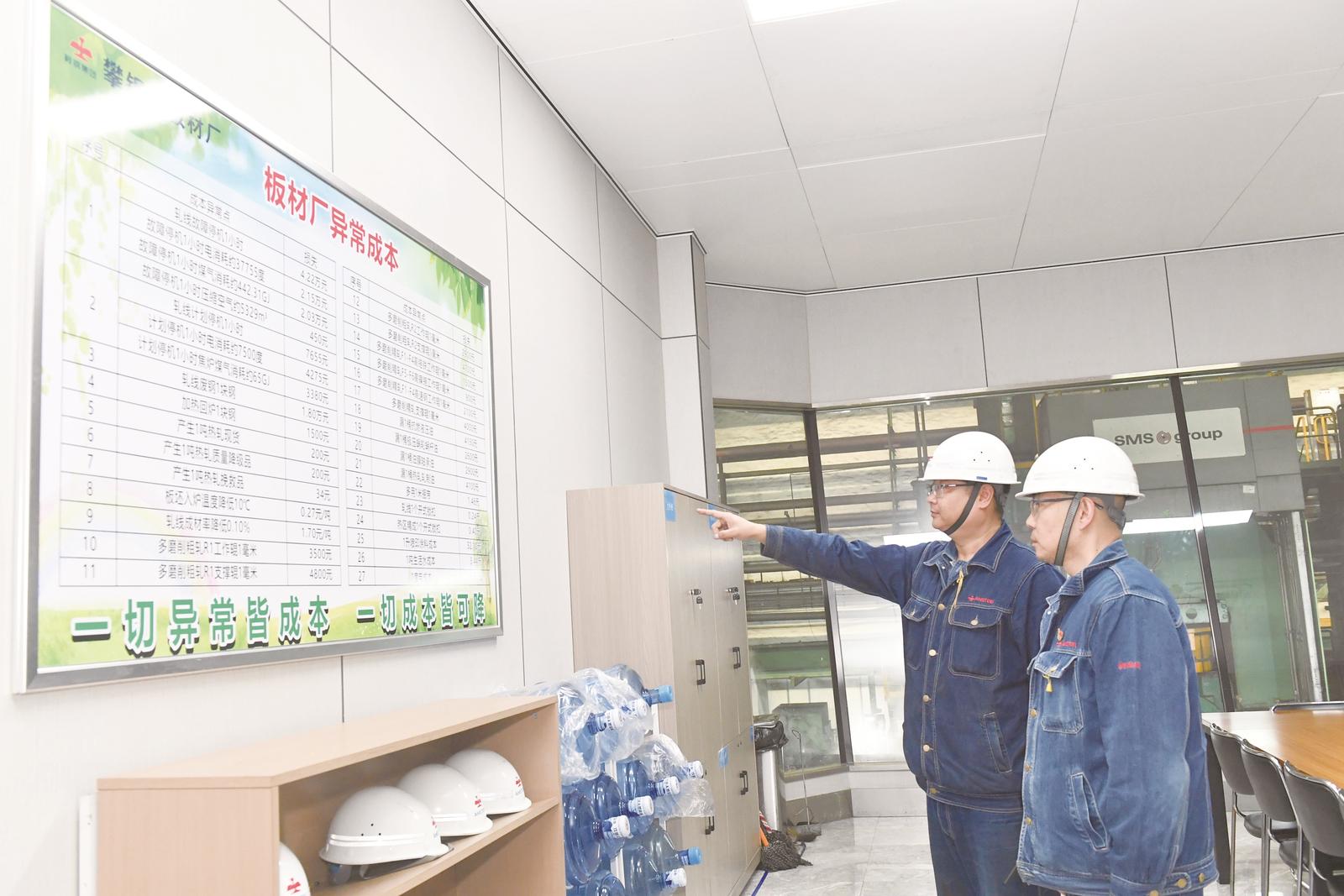 1月13日,攀钢钒板材厂热区生产单元职工王俊与杨晓明(左)正在讨论生产异常成本。今年以来,该厂将生产指标价值化,实现异常成本清单上墙,全面开展成本班班算、人人算、天天算的算账生产模式,追求极致成本管控,力保生产经营目标顺利完成。(何仁江 摄影报道)