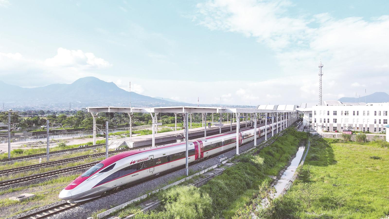 2023年10月17日正式开通运营的印尼雅万高铁全长142.3公里,全部采用攀钢生产的百米定尺钢轨。图为2025年5月20日,在印度尼西亚万隆,一列雅万高铁高速动车组列车驶出德卡鲁尔站。(新华社记者 徐钦 摄)