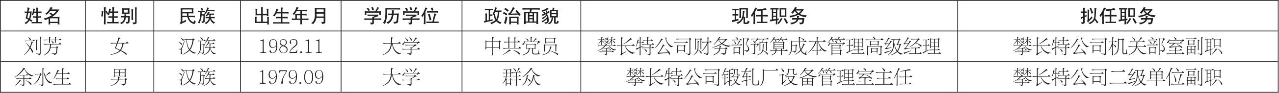 攀钢集团江油长城特殊钢有限公司2名拟任职领导人员名单