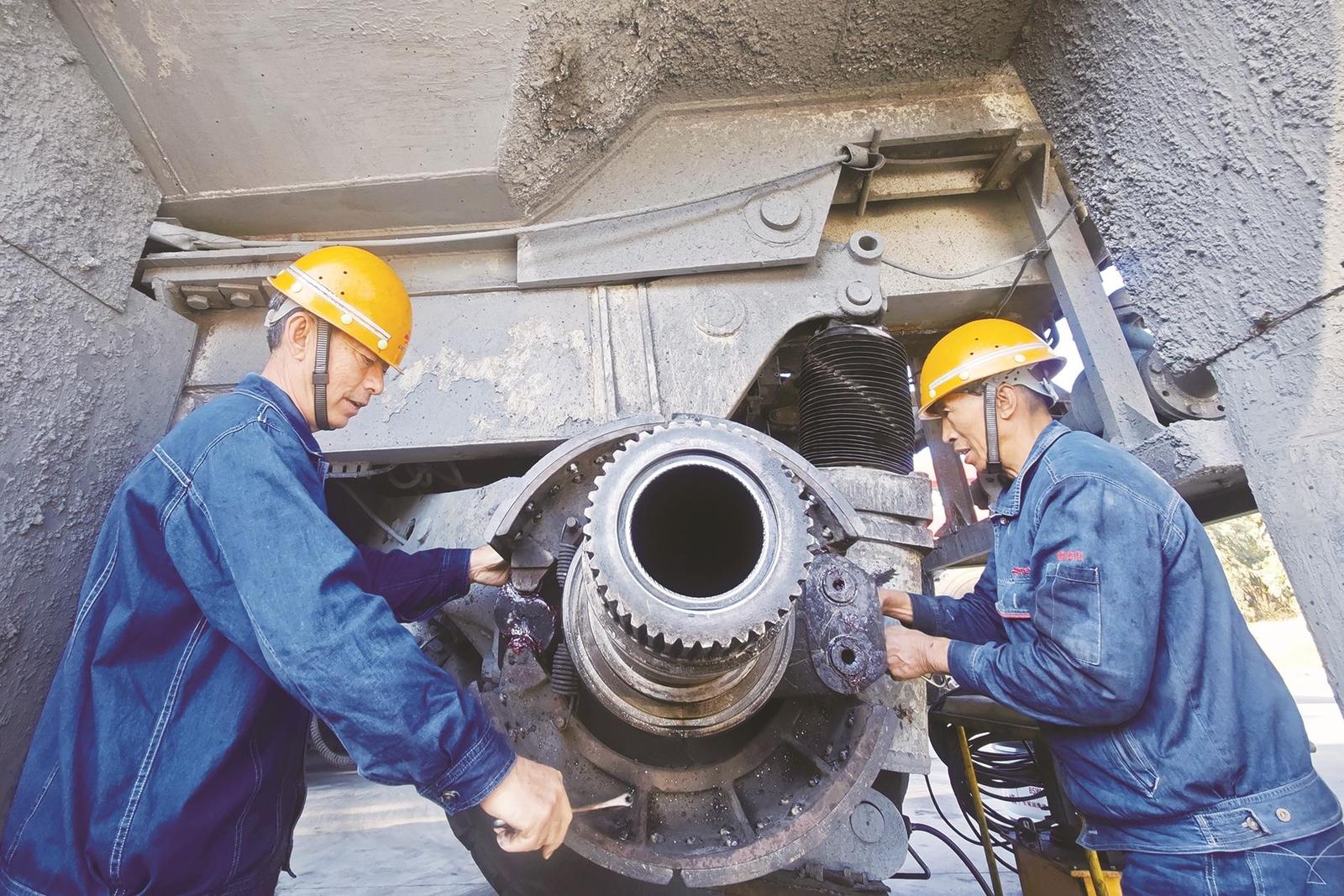 职工修复矿用汽车后轮轴承。